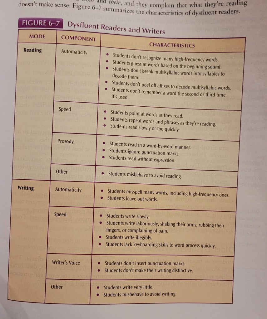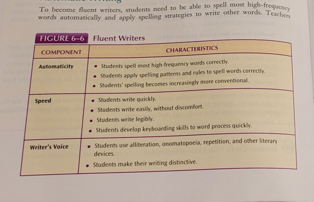 I also think the chapter made a great point when it mentioned that while it is important to take note of and give practice to those who are struggling to be fluent readers/writers, we also must keep our average or above average students in mind. Especially in younger grade levels! If we, as educators, let simple reading and writing mistakes occur with our students who are fluent, we are setting them up to develop habits that will hurt their reading and writing in the future.